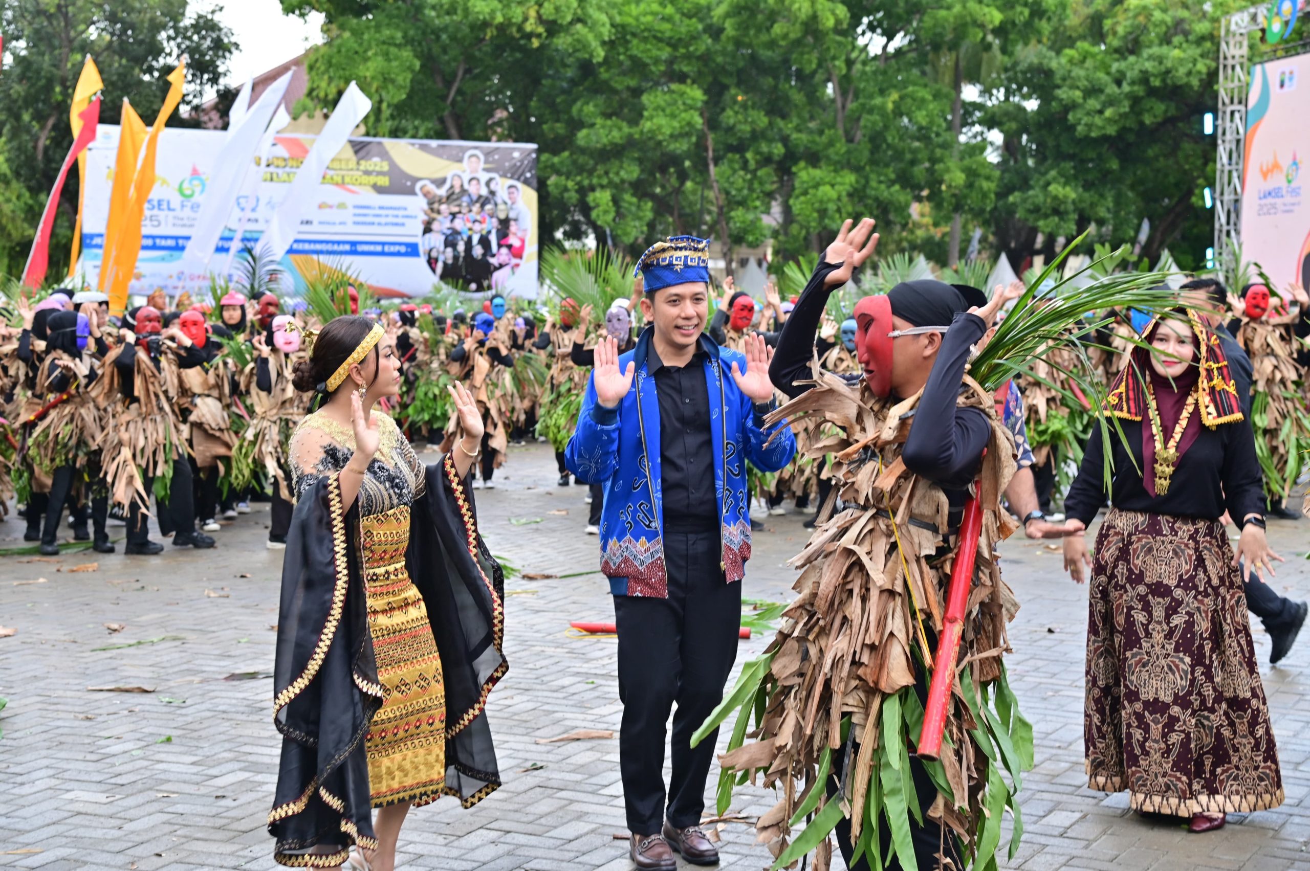 Deru musik tradisional Lampung, hentakan kaki ribuan penari, serta gemerlap topeng 12 wajah menciptakan panorama budaya yang tak hanya memukau, tetapi juga menggugah rasa bangga ribuan penonton.