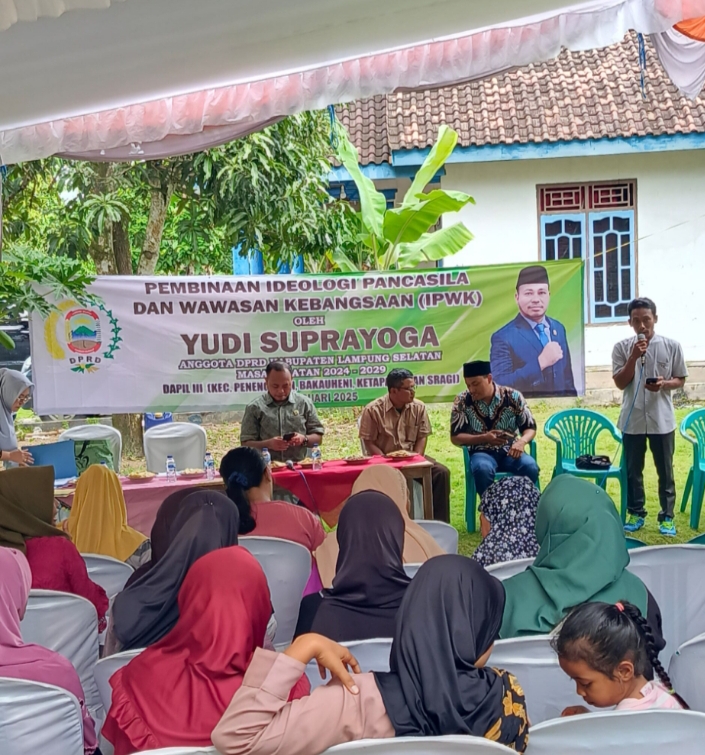 LAMPUNG SELATAN – ( MEDIA WARTAMANGGALA.COM ) – Anggota Dewan Perwakilan Rakyat Daerah (DPRD) Kabupaten Lampung Selatan (Lamsel) Yudi Suprayoga menggelar pembinaan Ideologi Pancasila dan Wawasan Kebangsaan (IPWK) di Dusun Sri Basuki, Desa Ruguk, Kecamatan Ketapang, pada Senin (17/2/2025).
