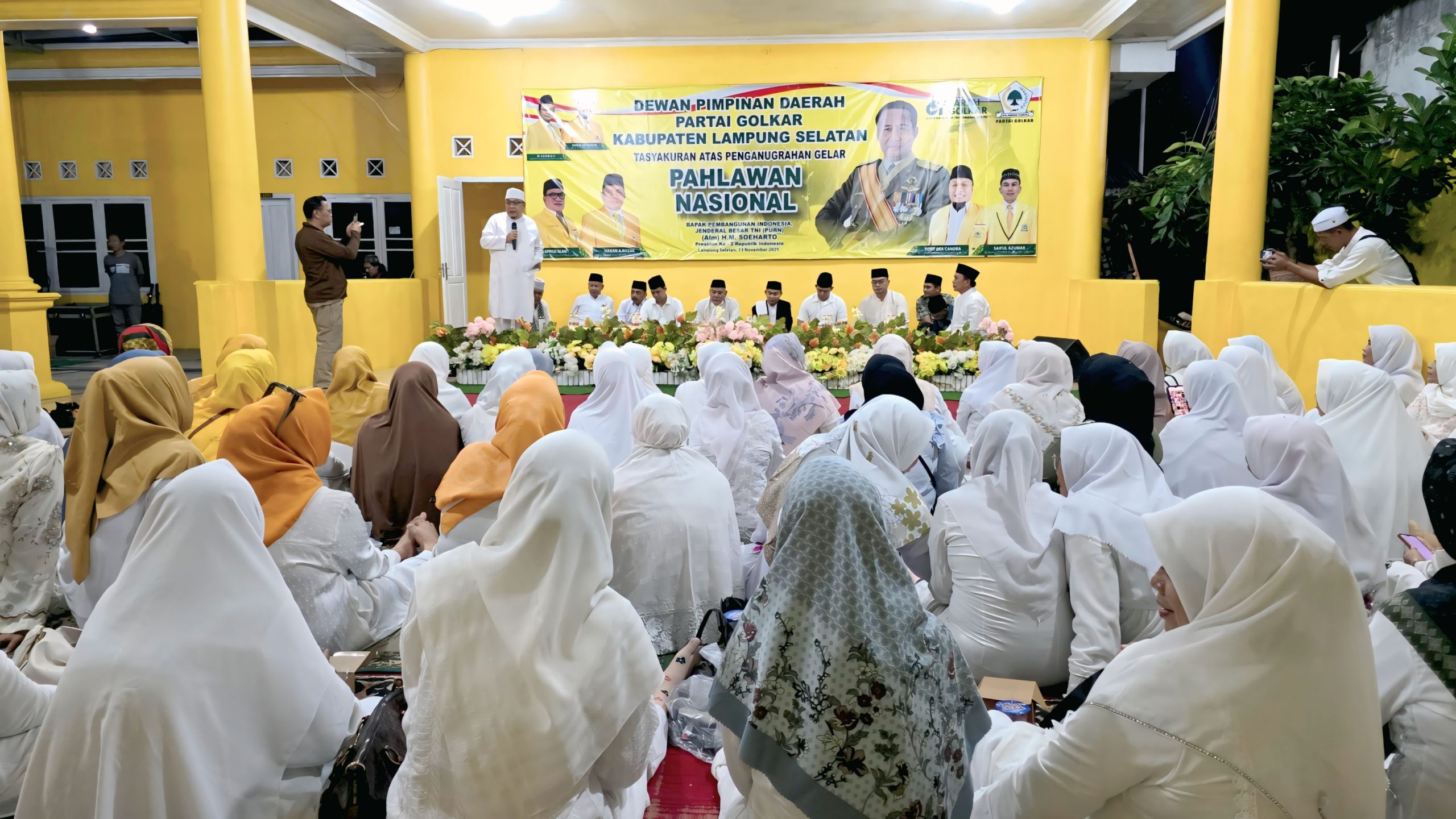 Lampung Selatan – ( MEDIA WARTAMANGGALA.COM ) – Dewan Pimpinan Daerah (DPD) Partai Golkar Kabupaten Lampung Selatan menggelar tasyakuran atas penganugerahan gelar Pahlawan Nasional kepada Presiden ke-2 Republik Indonesia, Jenderal Besar H. M. Soeharto. Acara berlangsung khidmat di halaman aula Kantor DPD Partai Golkar Lampung Selatan, Kamis malam (13/11/2025), dan dihadiri ratusan jamaah, kader, serta tokoh masyarakat.