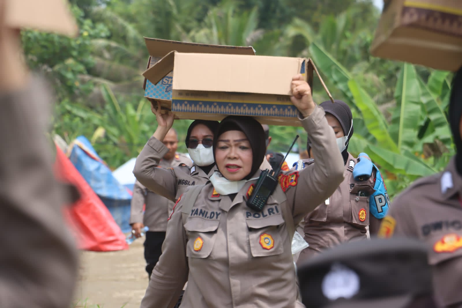 Selain menyalurkan bantuan, suasana di pengungsian juga dipenuhi kehangatan dengan kehadiran para polisi wanita (Polwan) dari Polres Lampung Selatan. Mereka menyambangi tenda-tenda pengungsi, khususnya tempat anak-anak berkumpul.
