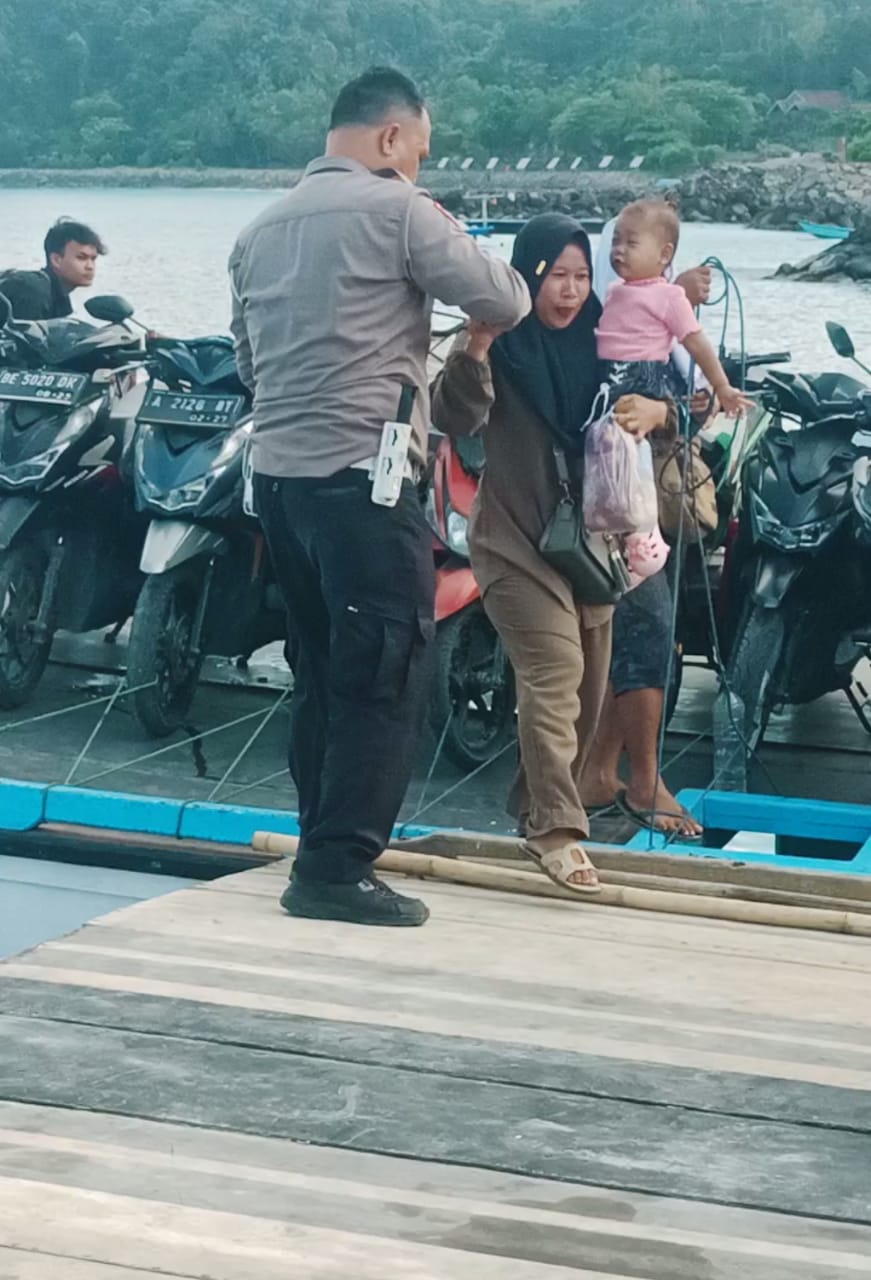 LAMPUNG SELATAN – ( MEDIA WARTAMANGGALA.COM ) – Aksi simpatik ditunjukan Anggota Satlantas Polres Lampung Selatan, Aipda Deni Meydistira, saat membantu warga seorang ibu menggendong anak kesulitan turun dari kapal perahu menuju di dermaga canti , Kecamatan Rajabasa, Lampung Selatan.